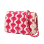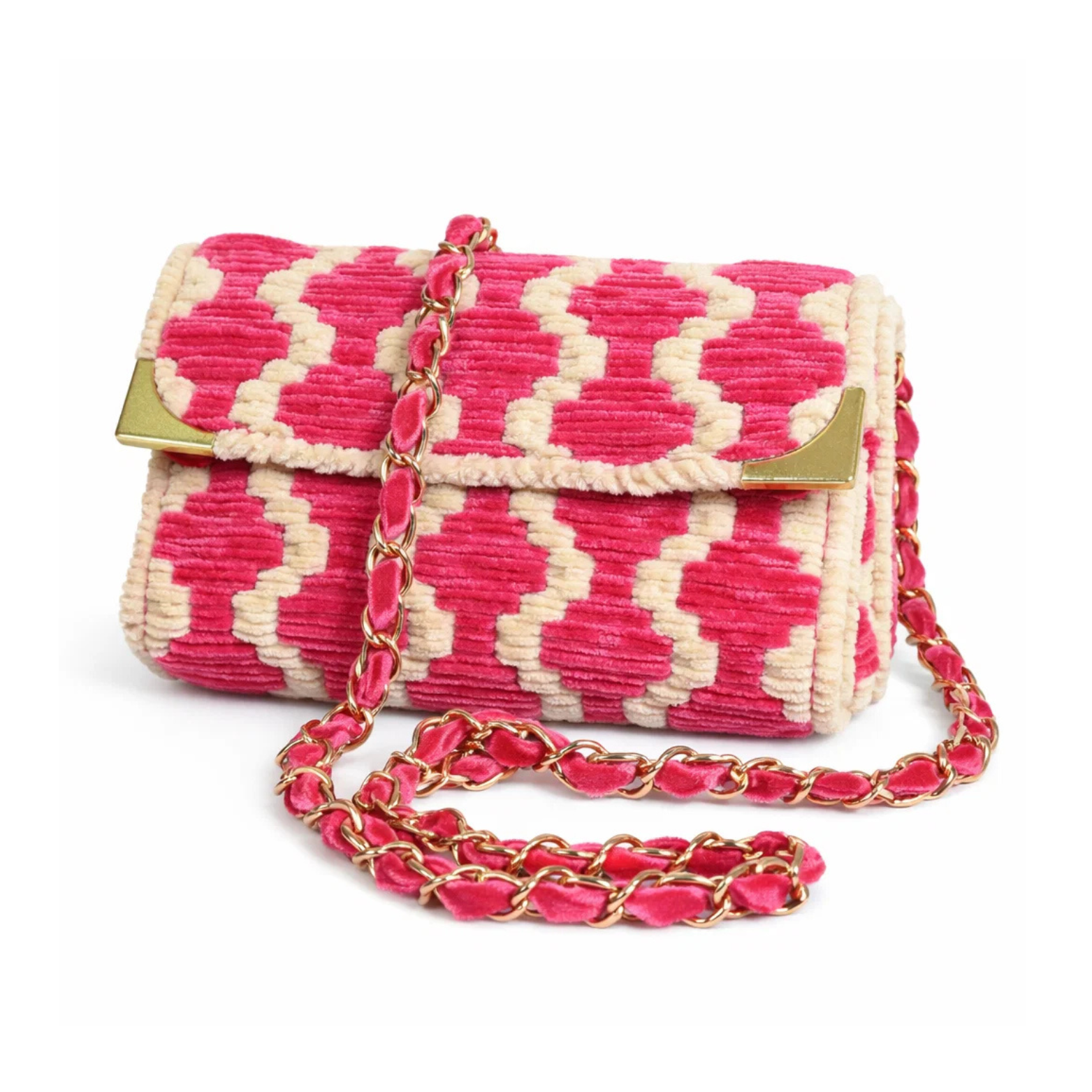 The structured silhouette and symmetrical pattern make this handbag visually appealing from every angle. The geometric velvet design adds a modern touch, while the soft pink color keeps it feminine and classy.