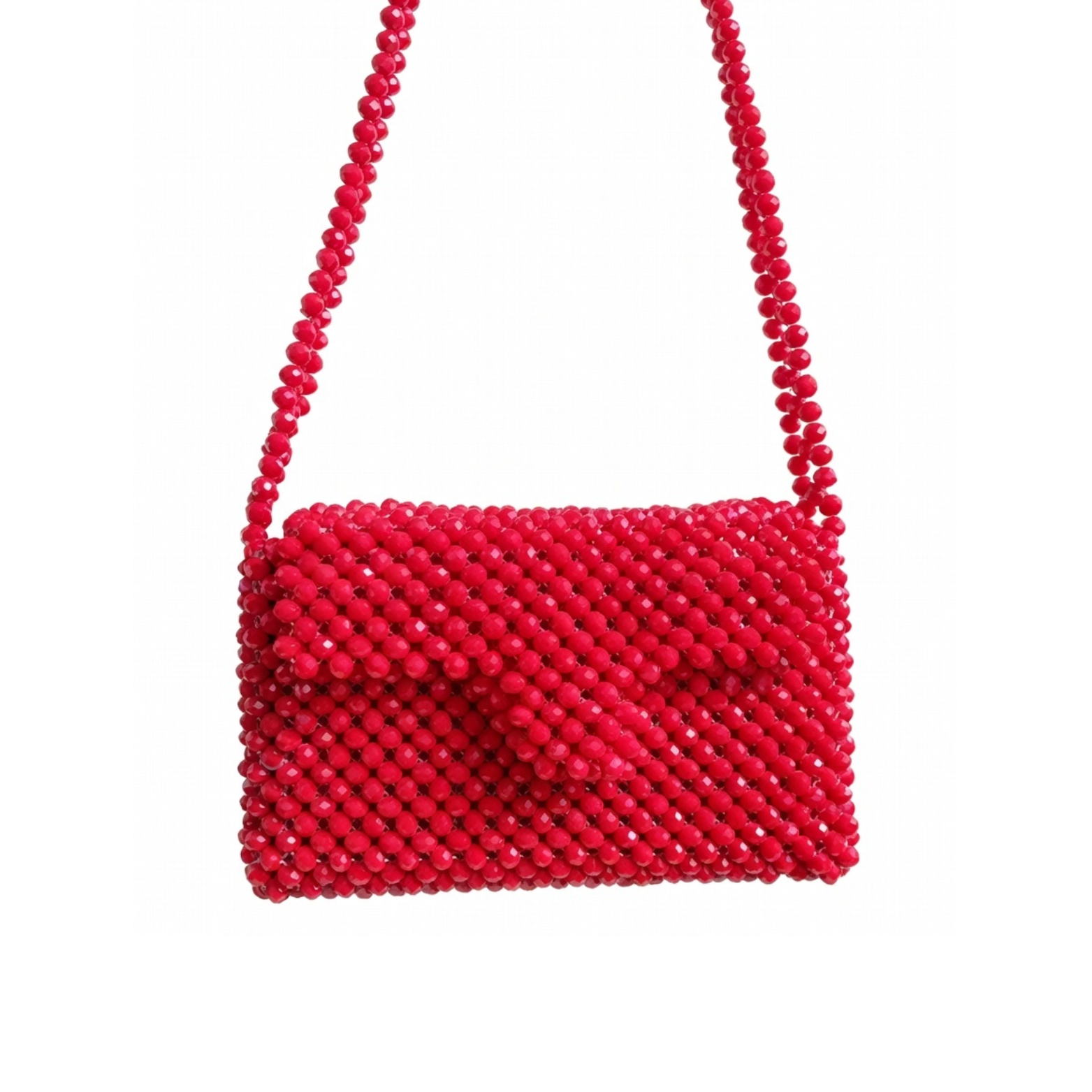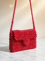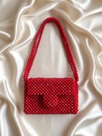 The compact yet elegant design features a ruched closure for a romantic touch, a matching red beaded shoulder strap (adjustable and removable) for versatile styling as a clutch, shoulder bag, or cross-body. Inside, a soft lining provides secure space for your essentials – phone, keys, cards, lipstick, and more – without compromising style.